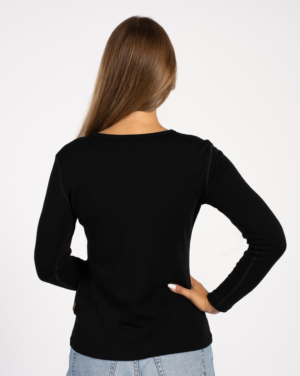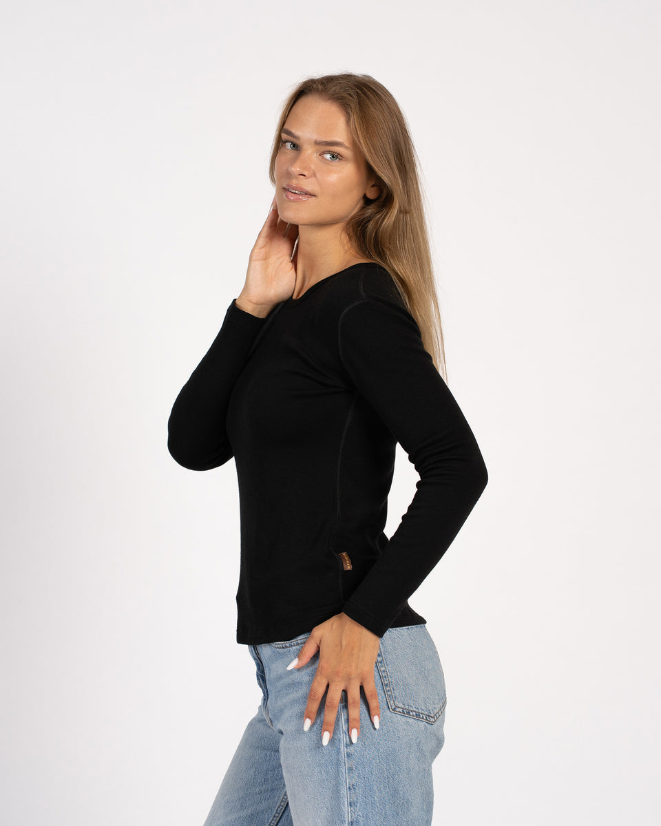 Heavenly soft to the touch, the midweight long sleeve top is crafted from 250gsm Merino wool, designed to flex for an active lifestyle while offering everyday comfort. This quick-drying, moisture-wicking women's long sleeve crew is non-itchy, stretches without absorbing sweat, and features a seamless silhouette that moves freely with your body despite its body-hugging shape. With natural antimicrobial and odor-resistant properties, the breathable pullover keeps you comfortable in a wide range of temperatures, making it perfect for late autumn runs or backcountry adventures. Luxurious enough to wear in public, it pairs beautifully with high-rise jeans or matching trousers for a complete, stylish look.