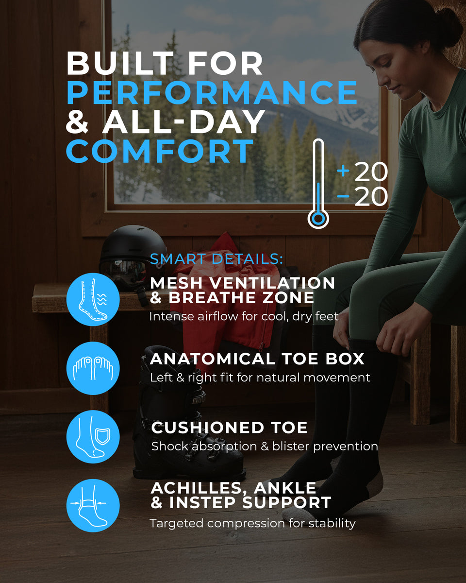 Meet your winter adventures with women’s thermal ski socks, made from a luxurious blend of Merino wool. Designed to support you from the first lift to the last run, these performance socks offer the perfect harmony of softness, warmth, and breathability – ideal for skiing, snowboarding, hiking or simply enjoying the cold in comfort. Merino wool’s natural temperature-regulating and moisture-wicking properties keep your feet warm and dry without overheating, while wool socks' silky touch feels gentle against the skin, even after hours in your boots.Enjoy the added comfort of extra cushioning, making these functional socks powerful in performance and ready for the mountains – these are the long socks your winter wardrobe has been waiting for!