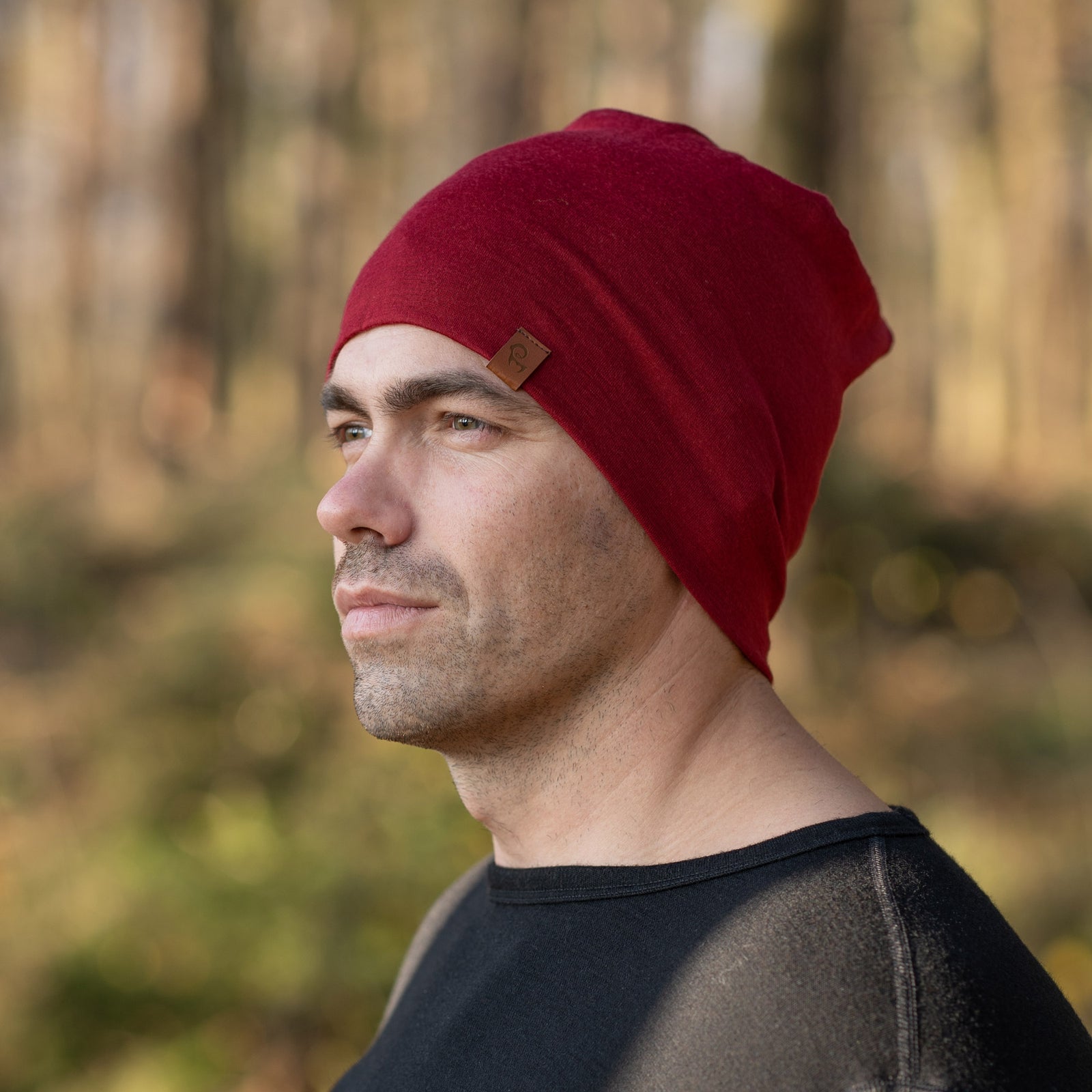 A man standing outside in a forest during fall season, wearing the menique Men's Merino Beanie Hat in Royal Cherry Color.