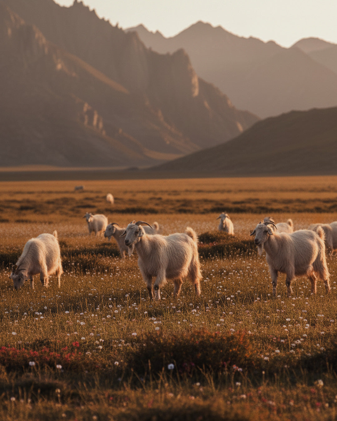 Cashmere's origin in the soft undercoat of cashmere goats contributes to its luxury status, with its fine, lightweight fibers prized for their exceptional warmth and luxurious softness.