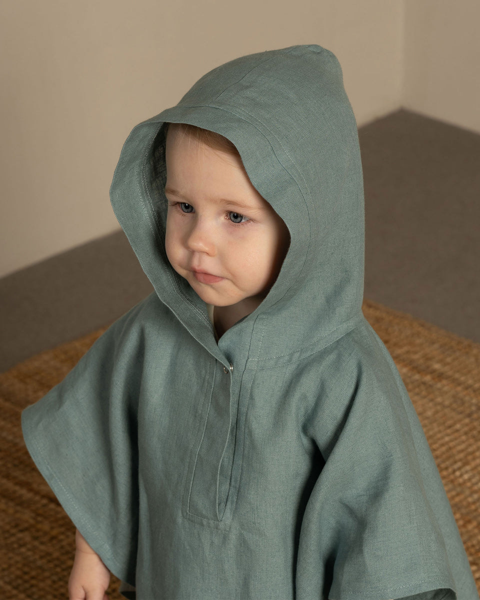 Skin-friendly baby ponchos for boys and girls feature a cute shirt design, hoodie, and a button on the neck for a secure fit. Made from 100% linen, our toddler ponchos perfectly dry the body and provide comfort.