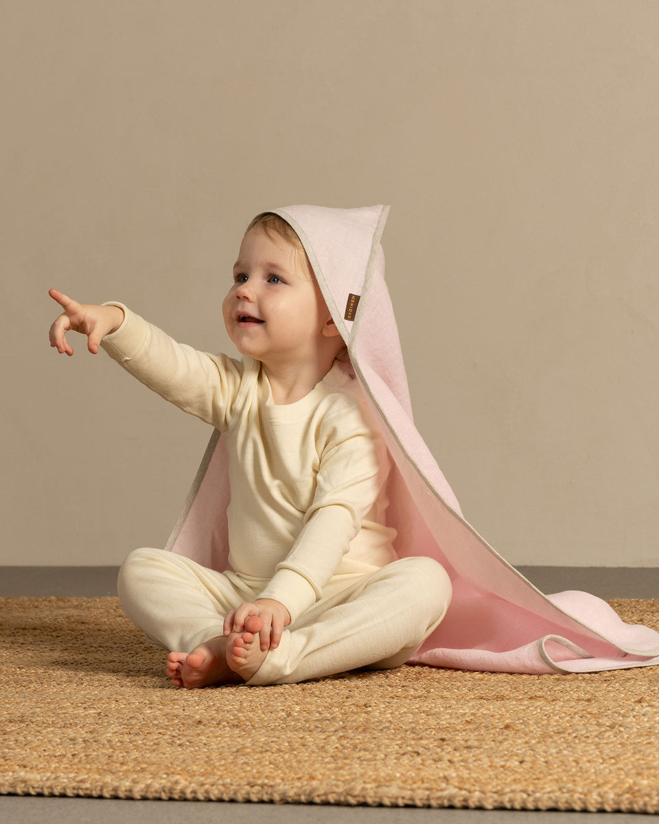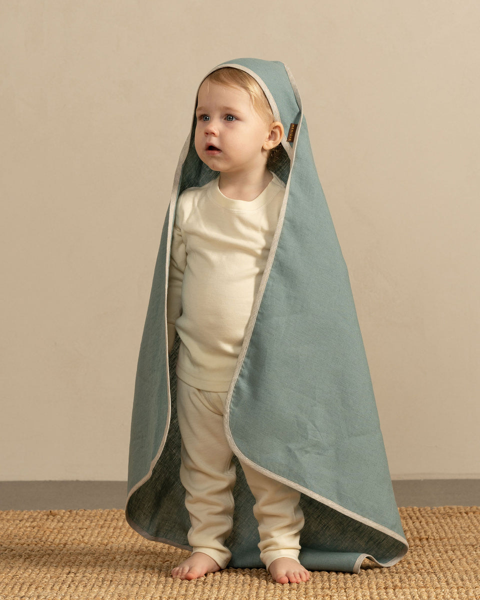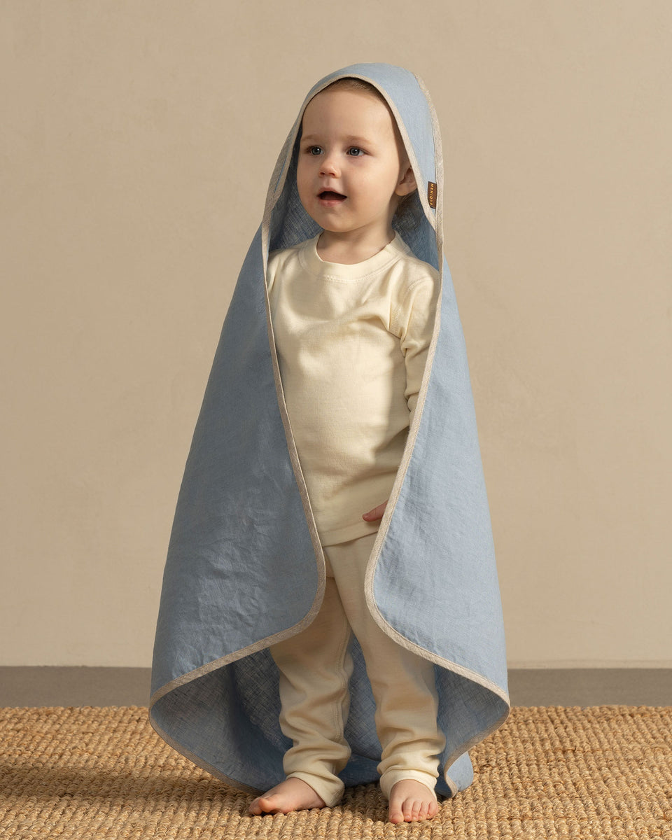 A hooded baby bath towel crafted from premium organic 100% linen fabric. Its superior absorbency quickly dries your baby after baths, gently enveloping your baby's head and body for a snug, comforting feel. The linen toddler towel can also be used as a swaddling blanket or a cover for a changing mat.