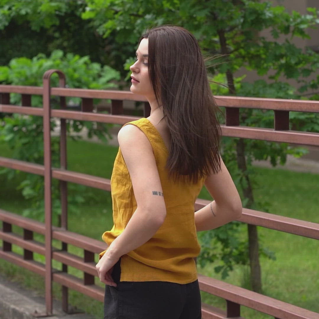 Hana tank top is a breezy summer blouse crafted from hypoallergenic and organic 100% Linen fabric which is known to be extremely breathable, moisture-wicking, and safe even on the most delicate skin. Linen tank features a round neck, relaxed silhouette, and straight cut. With small splits on both sides, linen top is the perfect partner to our high-waisted linen pants Dakota or skirt Sophia.