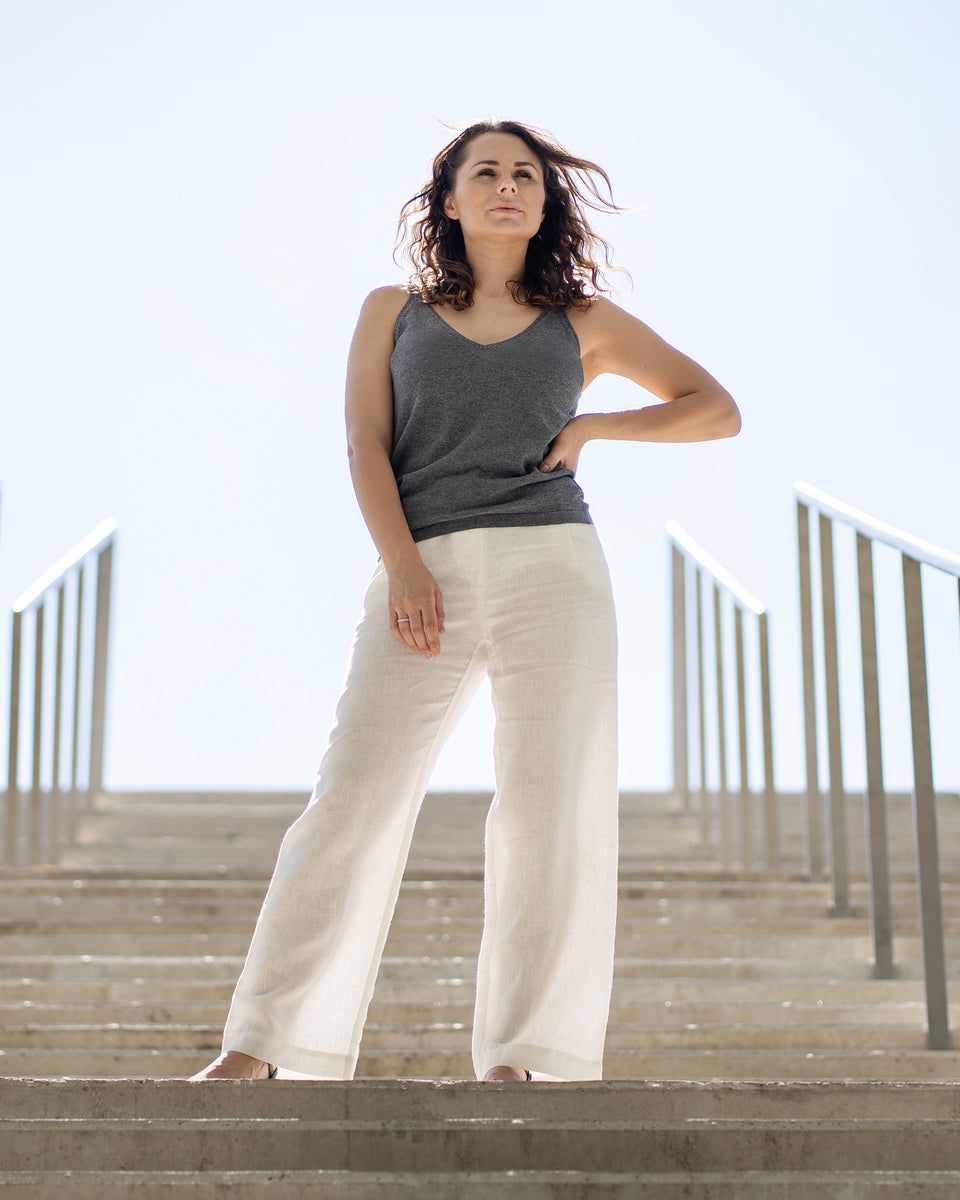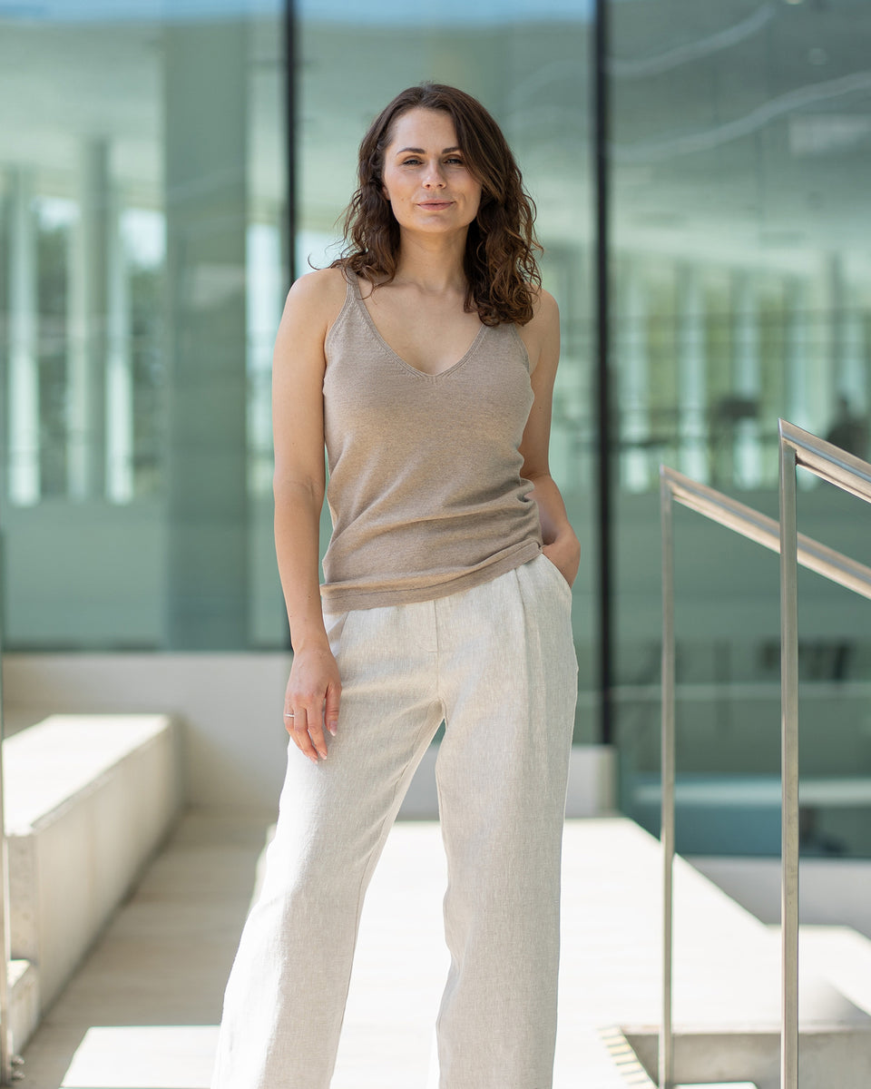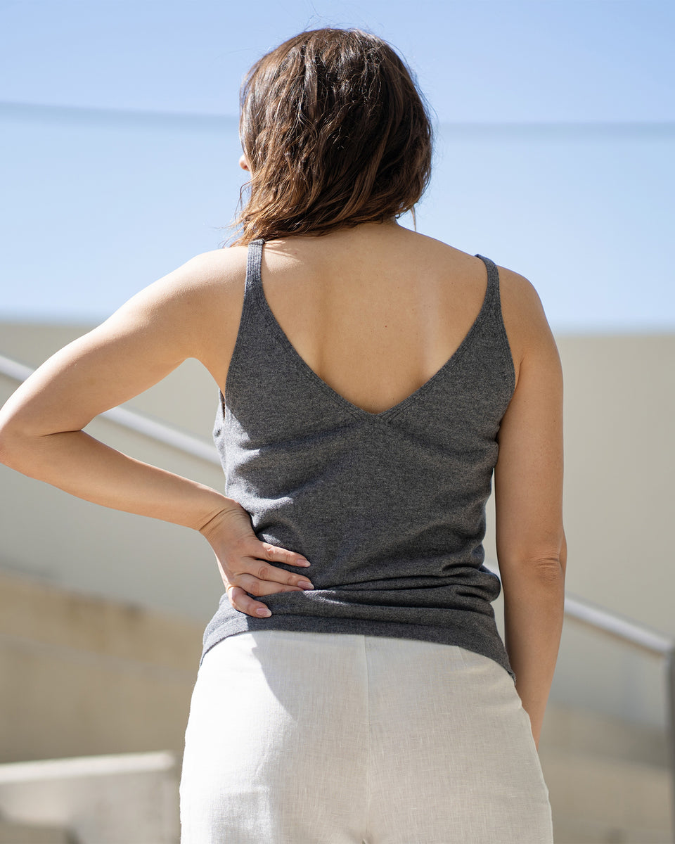 Feel the modern luxury of this high-quality merino wool and cashmere sleeveless tank top, a wonderful addition to your casual days or elegant summer evenings. Premium merino wool and cashmere blend offer all-season comfort, ultimate softness, and breathability all day long. The timeless classic silhouette and V-neck of this sleeveless top provide versatility for layering or wearing on its own, creating various outfits for different occasions or everyday wear. Made from premium, lightweight material, this sleeveless knit ensures an elegant, modern, stylish look and natural comfort – a coziness that you can feel every day.